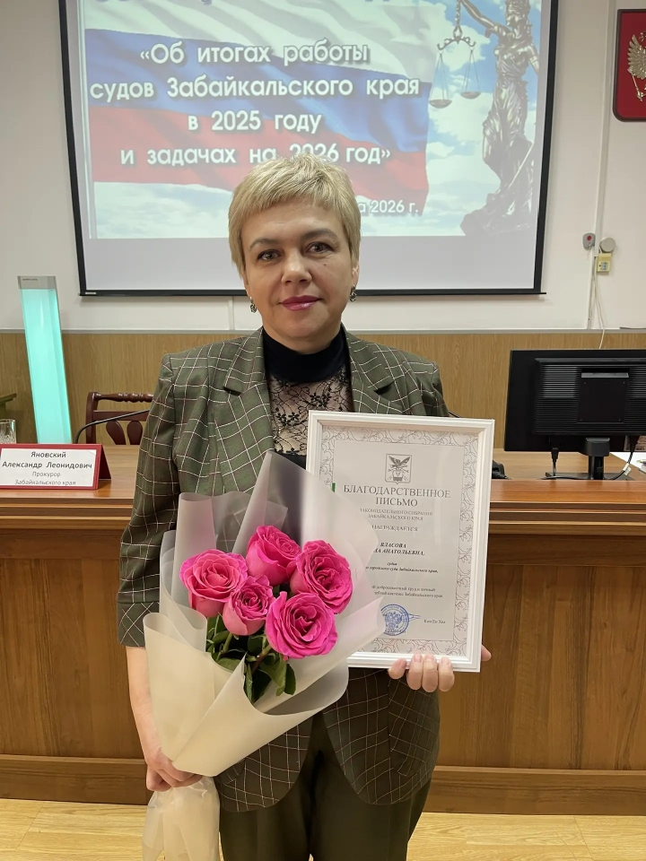 На совещании судей Забайкальского края по итогам работы судов общей юрисдикции за 2025 год, состоявшемся 12 марта 2026 года, награждена Благодарственным Письмом Законодательного Собрания Забайкальского края судья Борзинского городского суда - Власова Ирина Анатольевна за многолетний добросовестный труд и личный вклад в развитие судебной системы Забайкальского края. Ирине Анатольевне по плечу любое сложное дело. Знания, жизненный и профессиональный опыт позволяют добиваться поставленных целей. Пресс - служба ![]() |